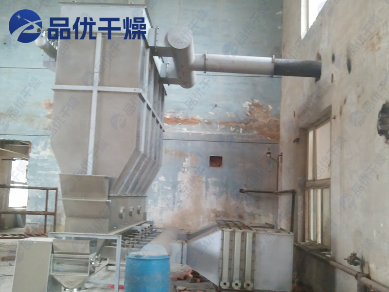 散粒状固体物料由加料器加入流化床干燥器中,过滤后的洁净空气加热后由鼓风机送入流化床底部经分布板与固体物料接触,形成流态化达到气固的热质交换。物料干燥后由排料口排出,废气由沸腾床顶部排出经旋风除尘器组和布袋除尘器回收固体粉料后排空。蒸汽、电、热风炉均可配用(按用户要求配套)。
