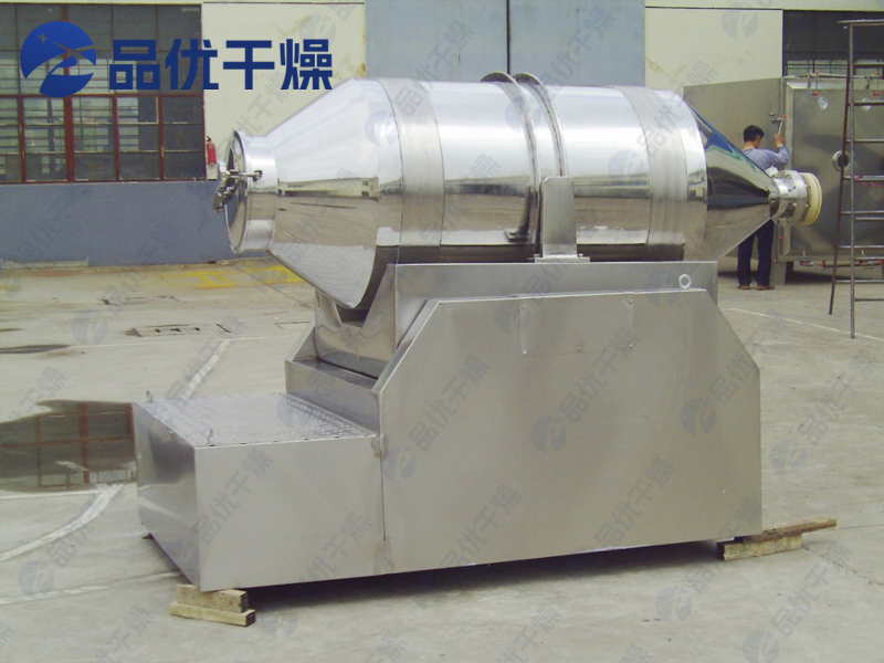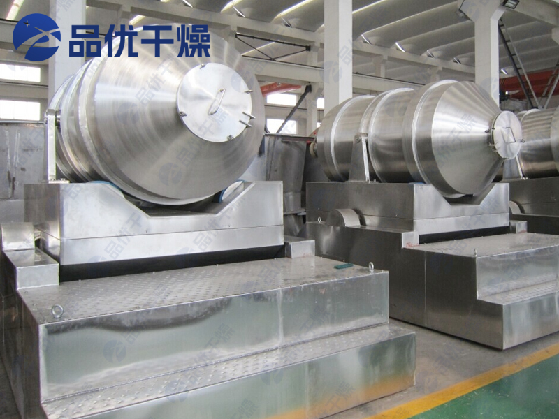 EYH系列二维运动混合机的转筒可同时进行二个运动,一个为转筒的转动,另一个为转筒随摆动架的摆动。被混合物料在转筒内随转筒转动、翻转、混合的同时,又随转筒的摆动而发生左右来回的掺混运动,在这两个运动的共同作用下,物料在短时间内得到充分的混合。EYH二维混料机适合所有粉、粒状物料的混合。