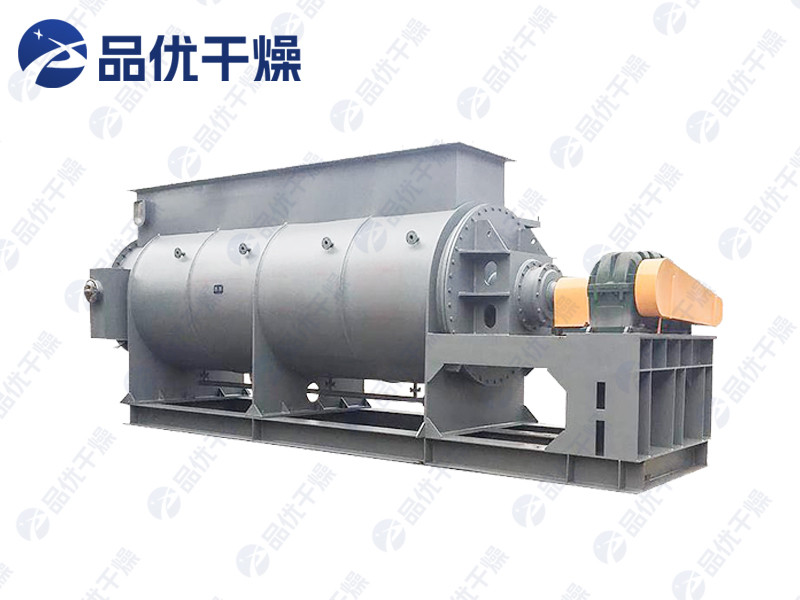 空心轴上密集排列着楔型中空浆叶,热介质经空心轴流经浆叶。单位有效容积内传热面积很大,热介质温度从-40℃到320℃,可以是水蒸汽,也可以是液体型:如热水、导热油等。间接传导加热,没有携带空气带走热量,热量均用来加热物料。热量损失仅为通过器体保温层向环境的散热。楔型浆叶传热面具有自清洁功能。物料颗粒与楔型面的相对运动产生洗刷作用,能够洗刷掉楔型面上附着物料,使运转中一直保持着清洁的传热面。浆叶干燥机的壳体为Ω型,壳体内一般安排二到四根空心搅拌轴。壳体有密封端盖与上盖,防止物料粉尘外泄而充分发挥作用。