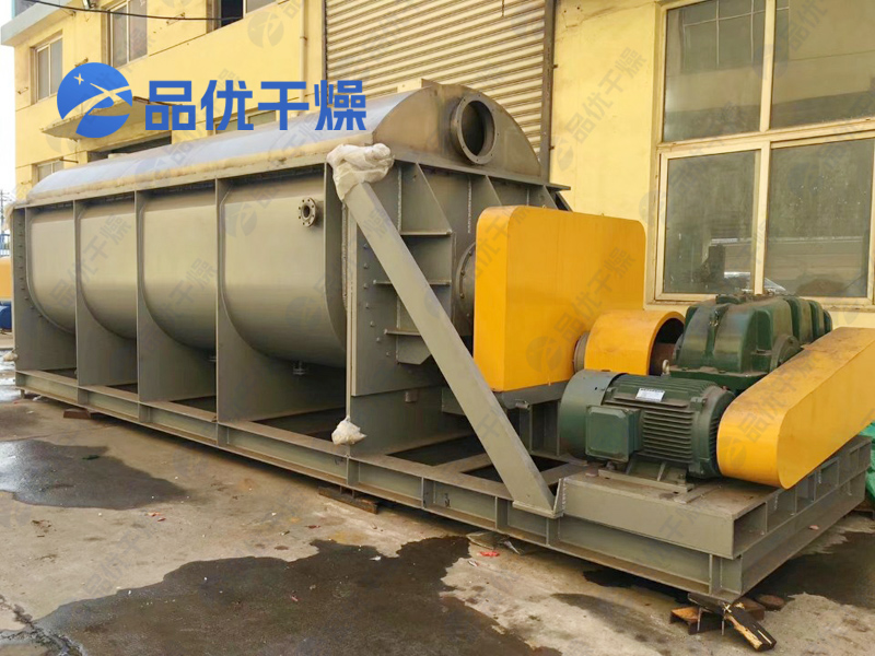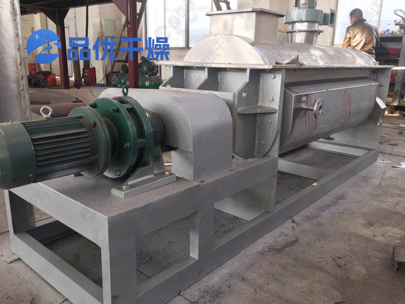 空心轴上密集排列着楔型中空浆叶,热介质经空心轴流经浆叶。单位有效容积内传热面积很大,热介质温度从-40℃到320℃,可以是水蒸汽,也可以是液体型:如热水、导热油等。间接传导加热,没有携带空气带走热量,热量均用来加热物料。热量损失仅为通过器体保温层向环境的散热。楔型浆叶传热面具有自清洁功能。物料颗粒与楔型面的相对运动产生洗刷作用,能够洗刷掉楔型面上附着物料,使运转中一直保持着清洁的传热面。浆叶干燥机的壳体为Ω型,壳体内一般安排二到四根空心搅拌轴。壳体有密封端盖与上盖,防止物料粉尘外泄而充分发挥作用。