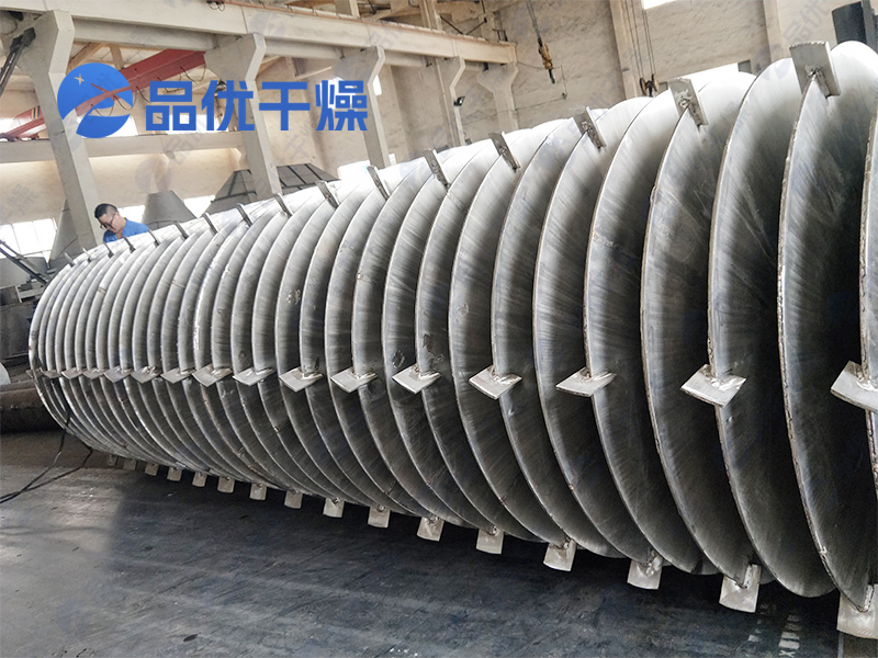 空心轴上密集排列着楔型中空浆叶,热介质经空心轴流经浆叶。单位有效容积内传热面积很大,热介质温度从-40℃到320℃,可以是水蒸汽,也可以是液体型:如热水、导热油等。间接传导加热,没有携带空气带走热量,热量均用来加热物料。热量损失仅为通过器体保温层向环境的散热。楔型浆叶传热面具有自清洁功能。物料颗粒与楔型面的相对运动产生洗刷作用,能够洗刷掉楔型面上附着物料,使运转中一直保持着清洁的传热面。浆叶干燥机的壳体为Ω型,壳体内一般安排二到四根空心搅拌轴。壳体有密封端盖与上盖,防止物料粉尘外泄而充分发挥作用。