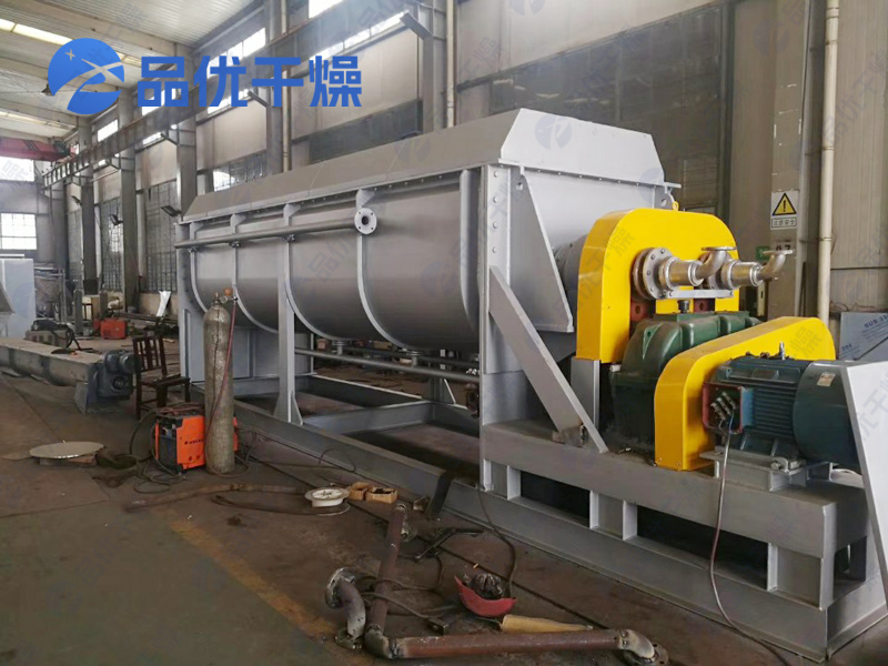 空心轴上密集排列着楔型中空浆叶,热介质经空心轴流经浆叶。单位有效容积内传热面积很大,热介质温度从-40℃到320℃,可以是水蒸汽,也可以是液体型:如热水、导热油等。间接传导加热,没有携带空气带走热量,热量均用来加热物料。热量损失仅为通过器体保温层向环境的散热。楔型浆叶传热面具有自清洁功能。物料颗粒与楔型面的相对运动产生洗刷作用,能够洗刷掉楔型面上附着物料,使运转中一直保持着清洁的传热面。浆叶干燥机的壳体为Ω型,壳体内一般安排二到四根空心搅拌轴。壳体有密封端盖与上盖,防止物料粉尘外泄而充分发挥作用。