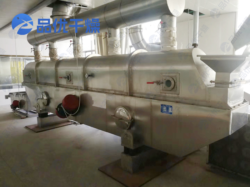 物料自进料进口进入机内,在振动力作用下,物料沿水平面流化床抛掷,向前连续运动,热风向上穿过流化床同湿物料换热后,湿空气经旋风分离器除尘后由排风1:3排出.干燥物料由排料进口排出。